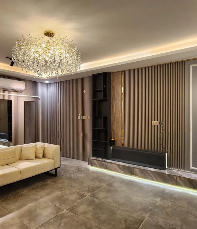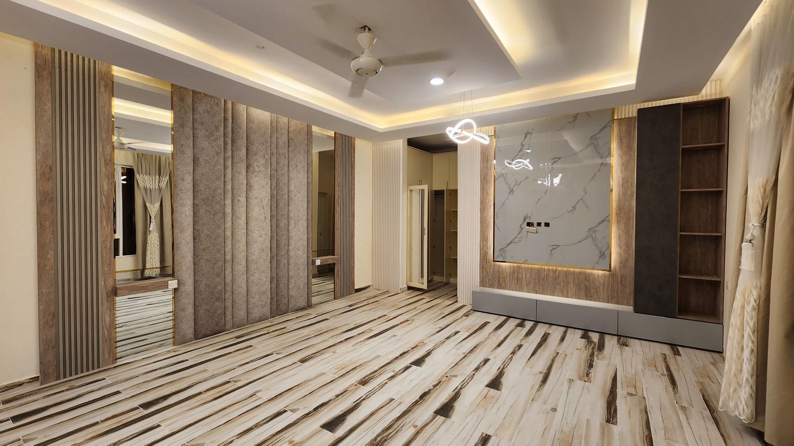Lighting & Ambience: Subtle lighting was integrated to highlight the mirror and fabric textures, enhancing the overall mood of the space.